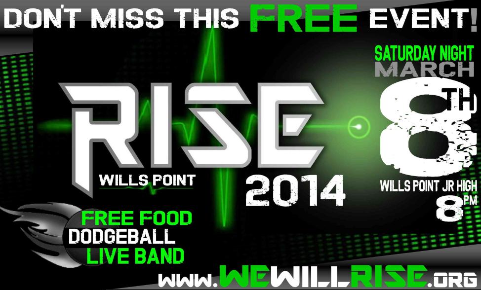 RISE 'Wills Point' 2014 will take place Saturday Night March 8th at Wills Point Junior High School in Wills Point, TX. RISE will feature a LIVE Band, FREE FOOD, AN INTENSE DODGEBALL TOURNAMENT, & A POWERFUL MESSAGE!!! Don't miss out!